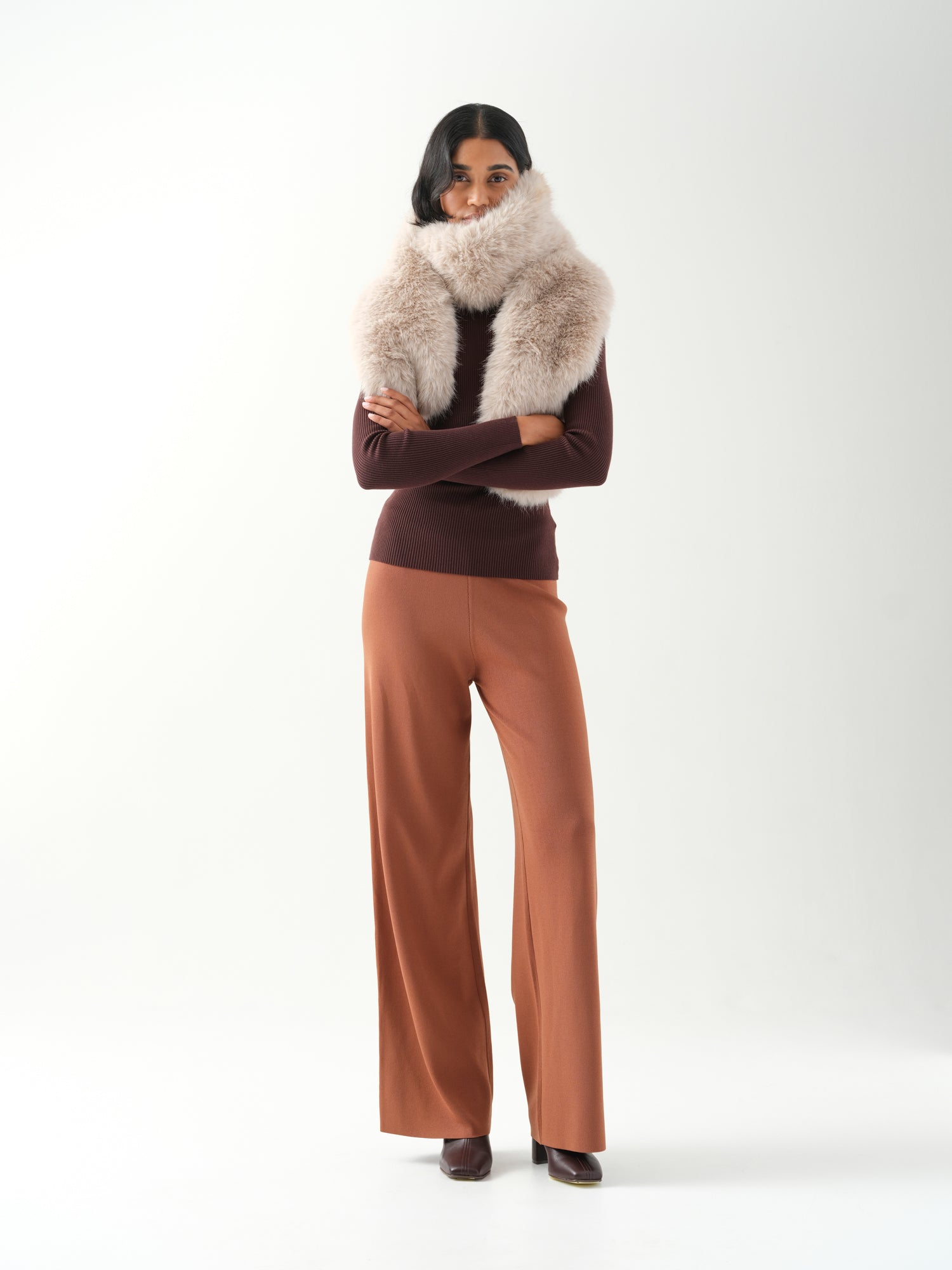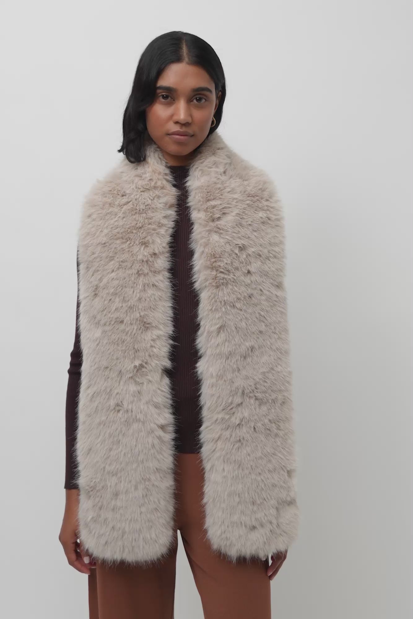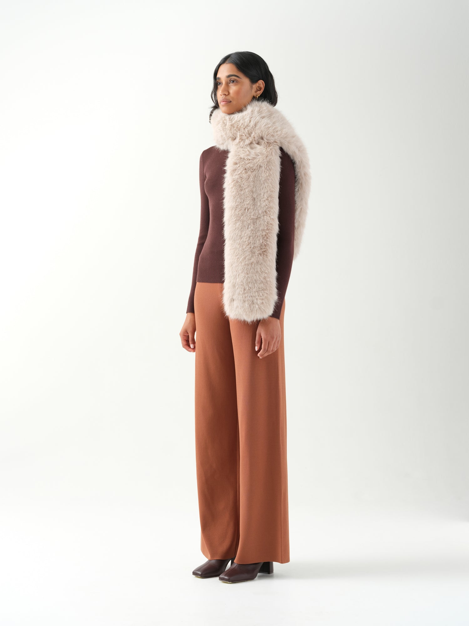 The West End Scarf in Almond is crafted from ultra-soft faux fur with a smooth finish. This streamlined silhouette offers subtle volume and luxurious texture, designed to drape naturally over the neckline. A minimal statement piece suited to day-to-night styling.