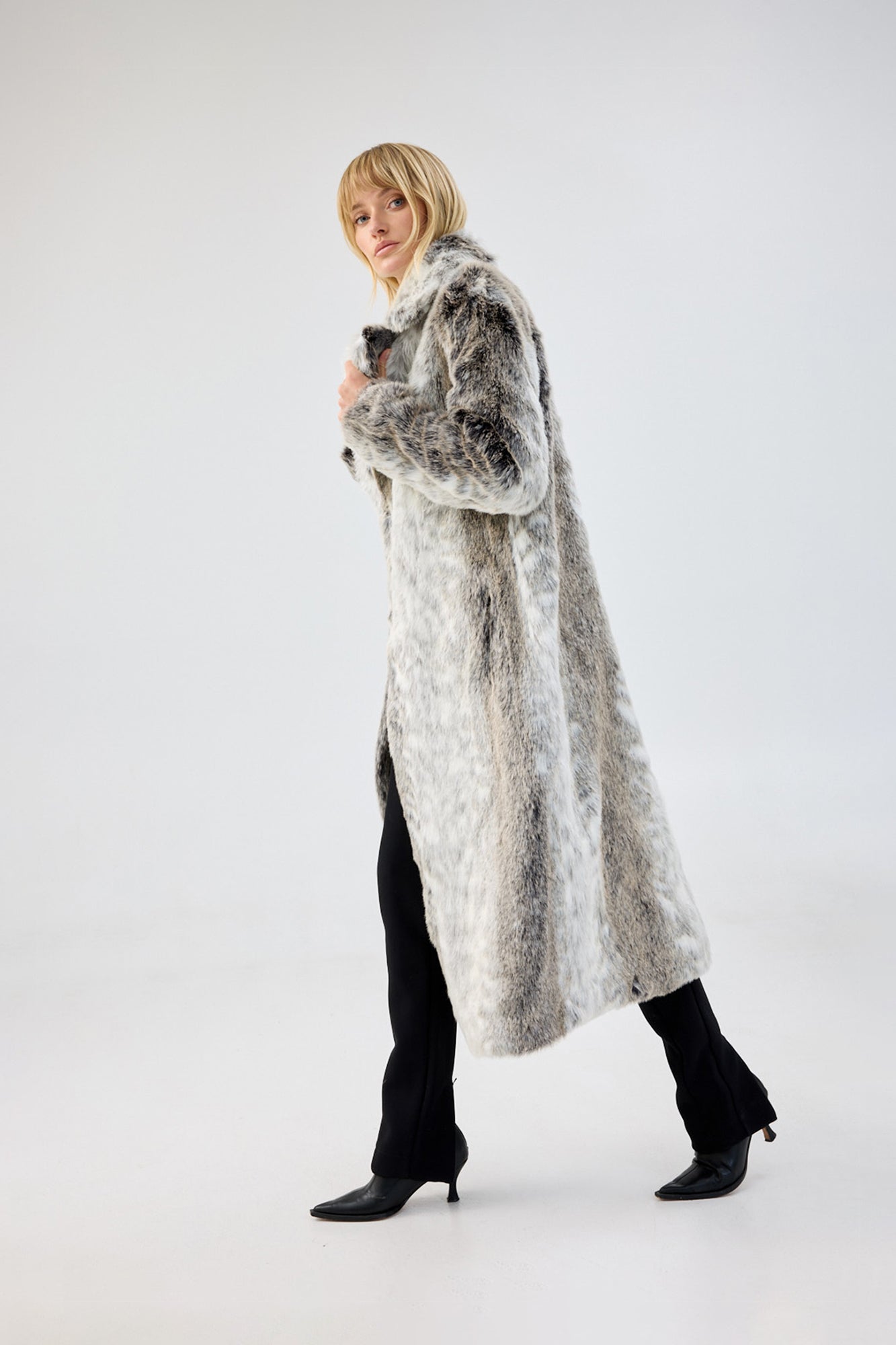 The luxe centrepiece of the season, the snow leopard Kathmandu Coat commands attention. This style features multi-toned faux fur, a notched lapel collar, and a well constructed topcoat silhouette for casual and formal wear.