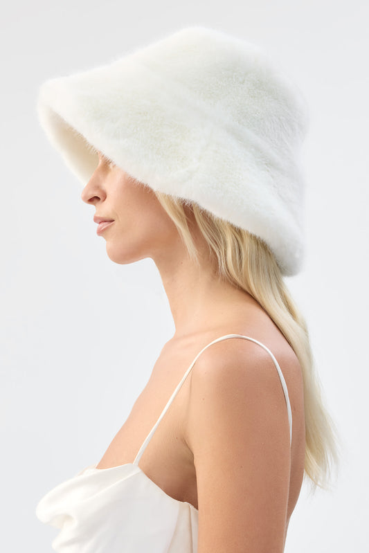 A fluffy fur bucket hat can be styled with minimal clothes for a chic contrast that elevates more simple outfits for formal events.