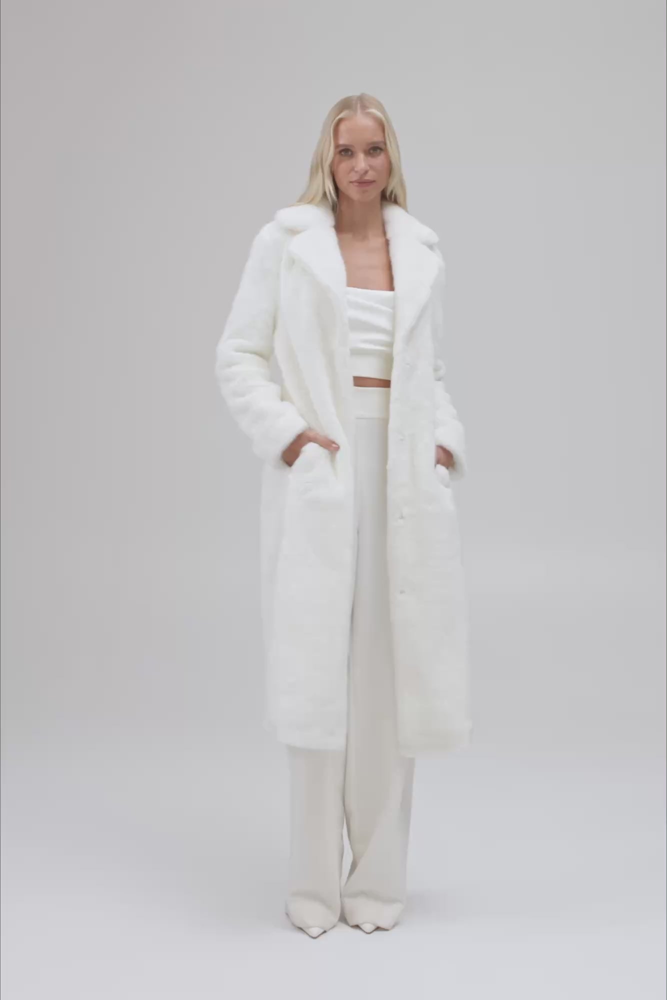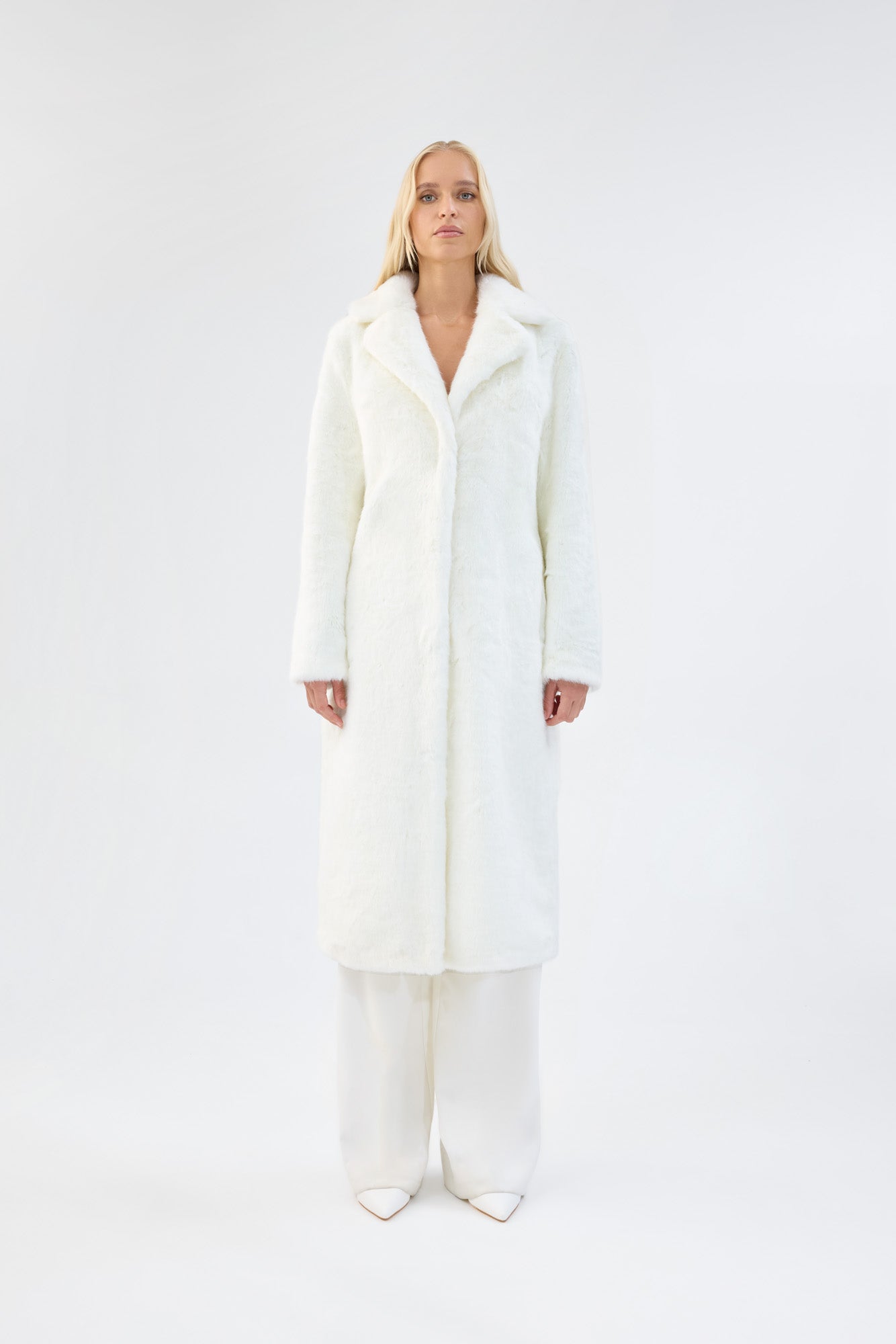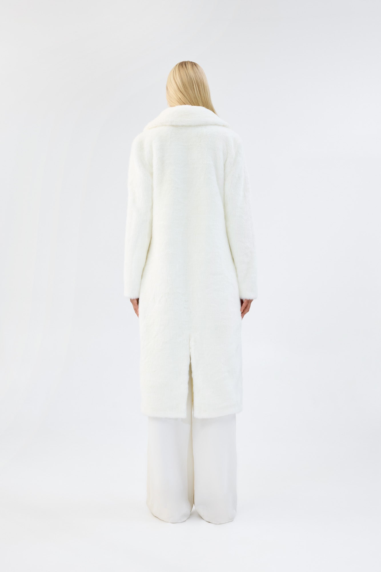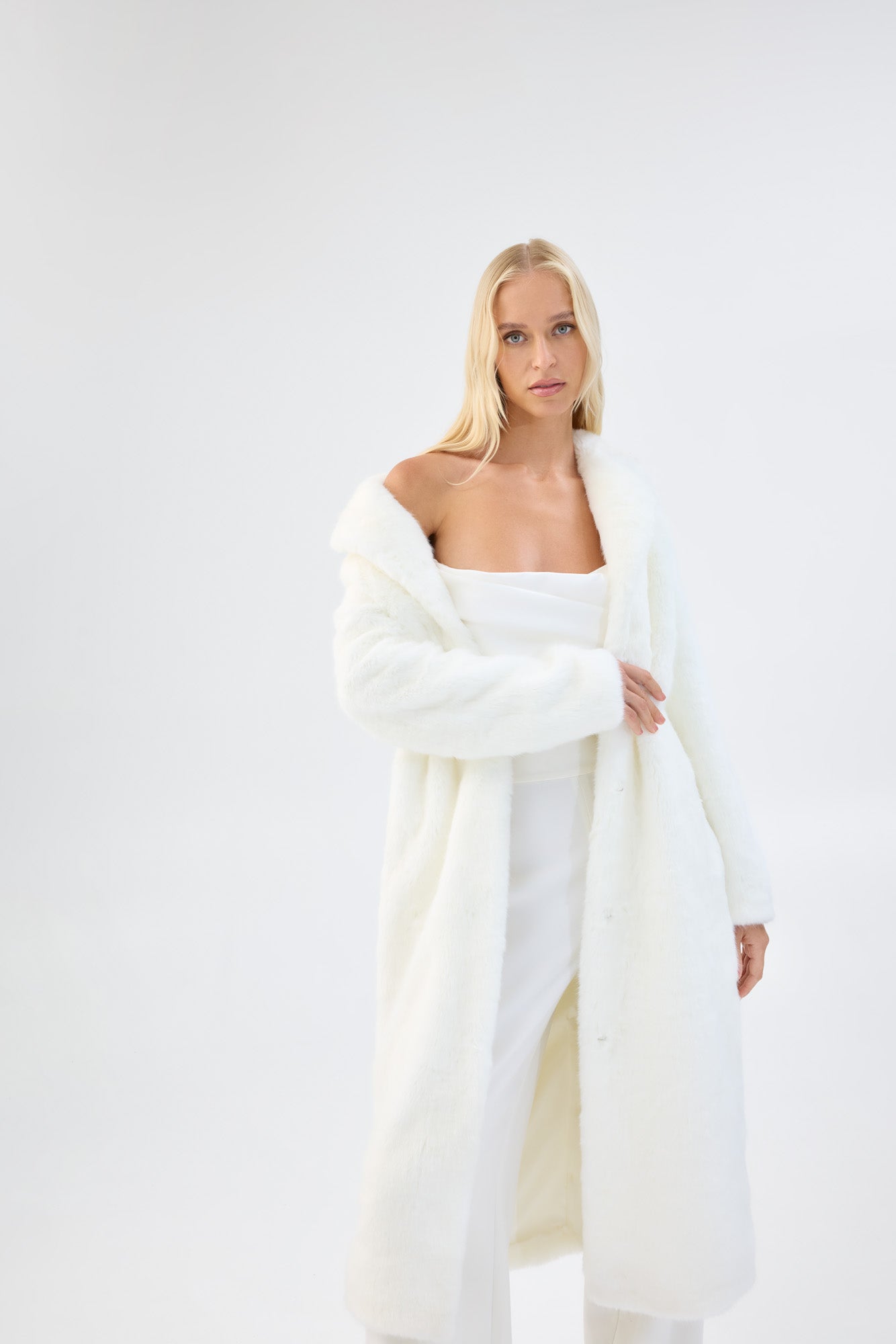 The Dove Coat redefines bridal outerwear with its plush faux-fur construction and tailored details. A notch lapel collar, back vent, and concealed closures combine functionality with elegance. Fully lined and crafted with cruelty-free materials, this coat elevates winter bridal styling.