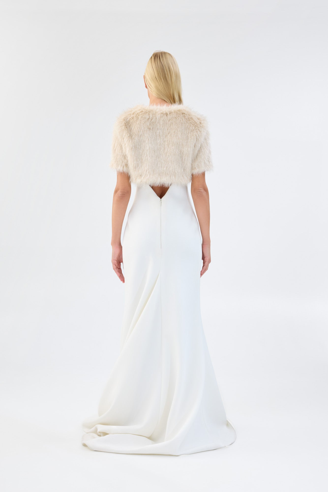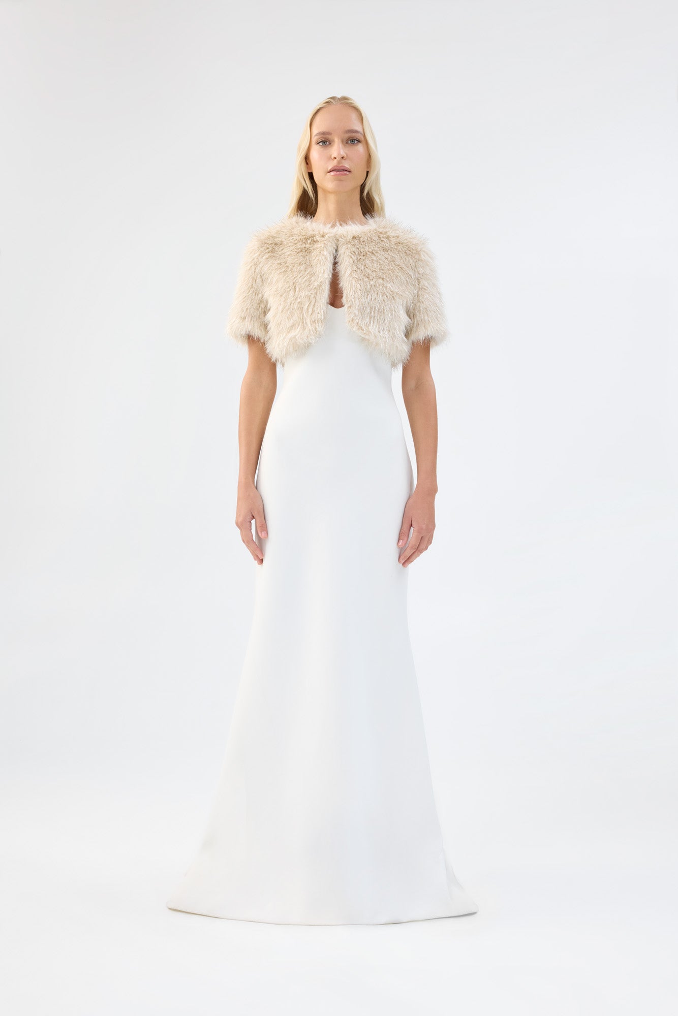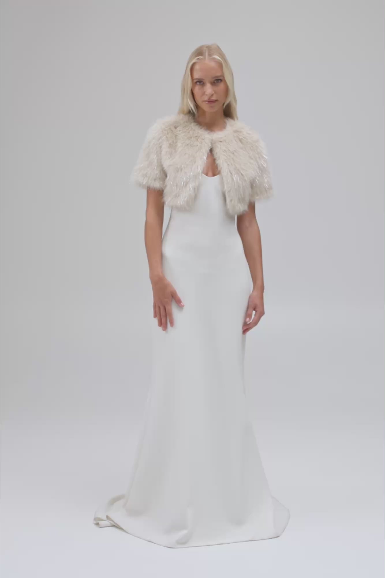 The Wings Bolero in Caramel delivers quiet sophistication. Medium-pile faux fur with metallic highlights is selected for its texture and shine. The cropped design and round neckline add contemporary refinement, while the vegan fabric-covered hook and eye closure ensures an effortless fit.