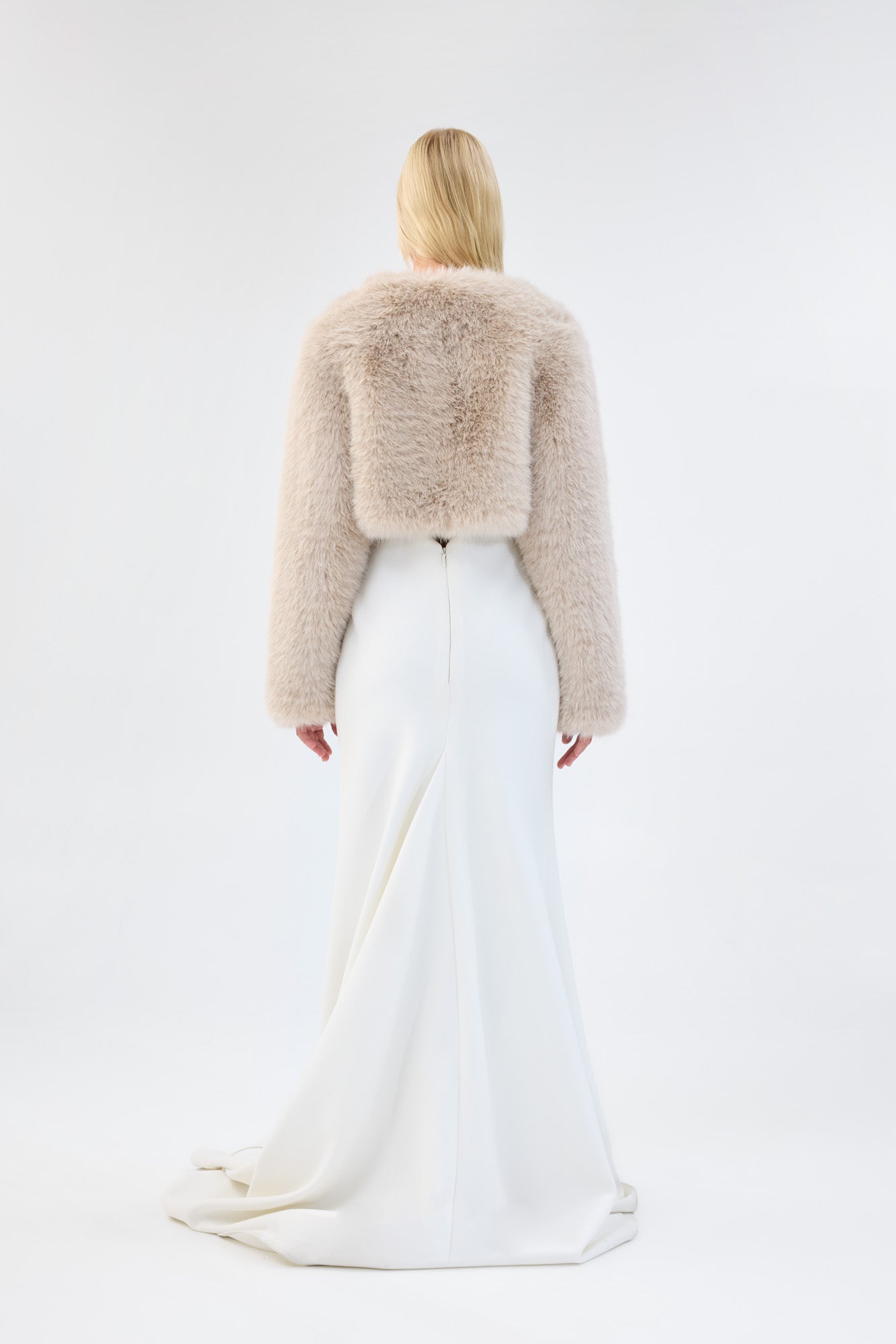The Empress Jacket exudes contemporary luxury. Lush faux fur creates its soft exterior, while a satin lining provides comfort. The cropped, open silhouette features curved seam lines and a slightly dropped shoulder, offering a relaxed yet refined bridal option.
