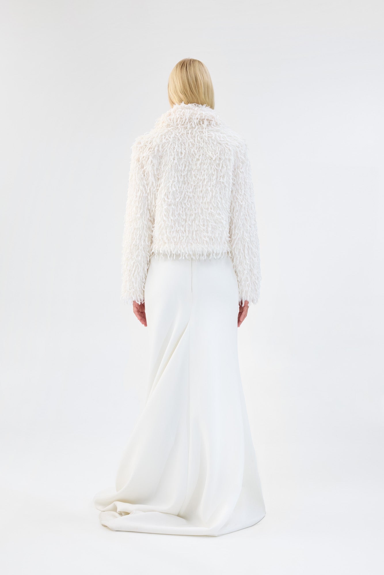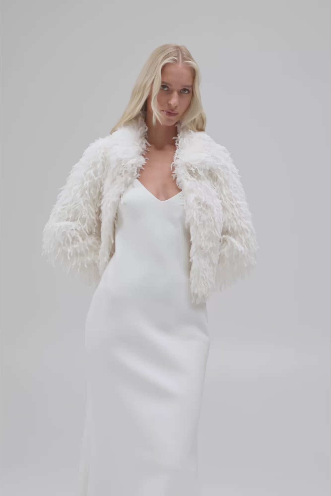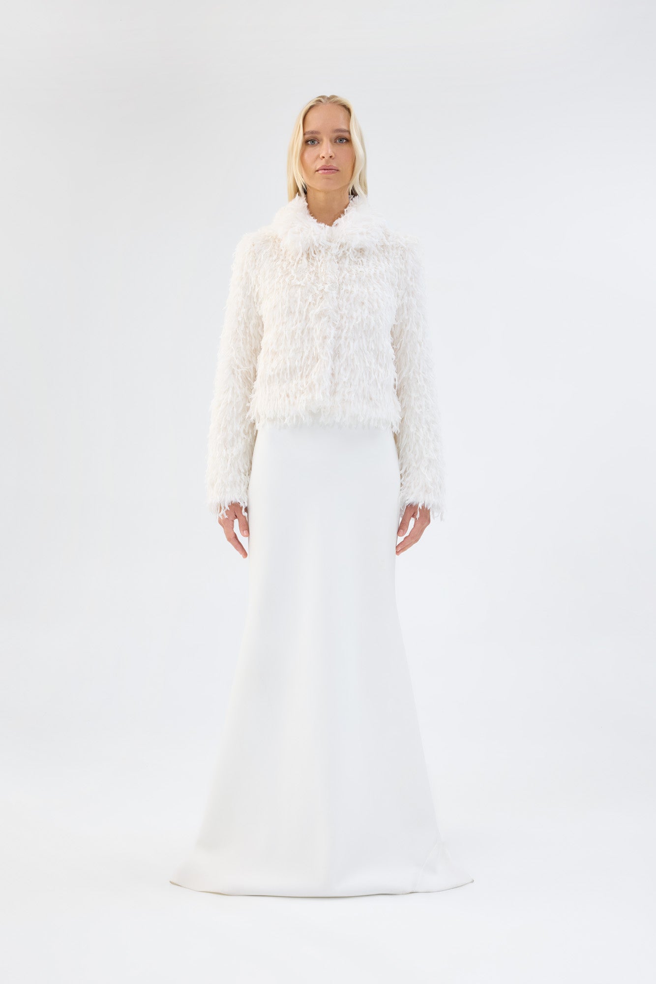 The Swan Lake Jacket balances warmth and elegance. Faux-feather fabric provides a luxurious, vegan-friendly texture, while a curved collar and cropped silhouette ensure a contemporary finish. Fully lined and fastened with four concealed snap closures, this jacket offers both functionality and style.