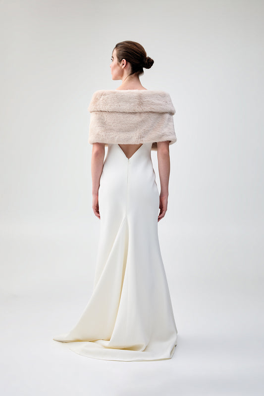 The right faux fur wrap for your wedding dress will complement the gown’s colour, style and neckline. A more plush, dramatic wrap may add some drama and volume to a simple gown, while something a little simpler can add to, but not take away from, a more prominent dress.