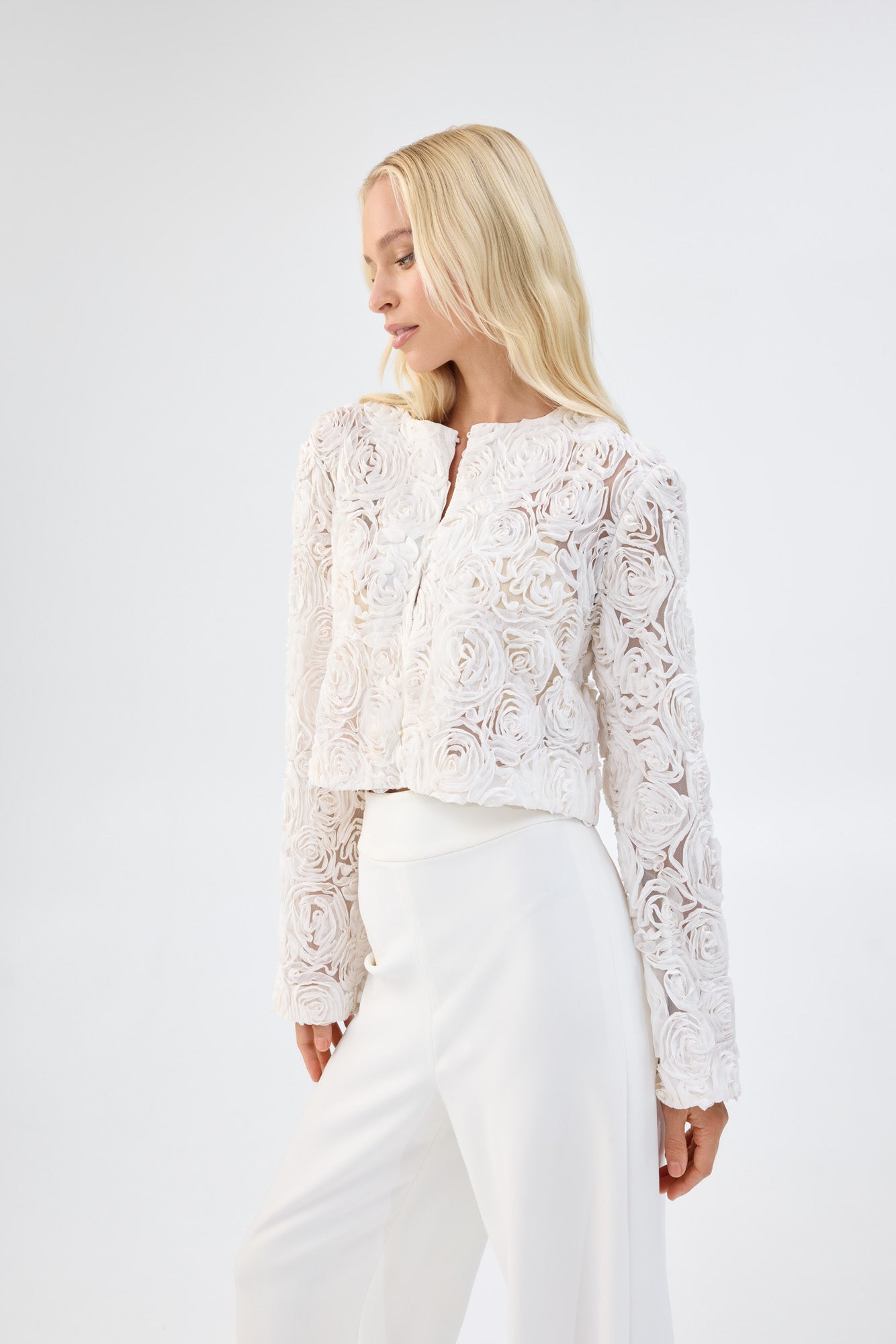 The Rosa Jacket in Blanc captures a delicate and romantic aesthetic. Sheer floral tulle appliqué fabric creates an airy, textured effect. Unlined and slightly stretchy, the jacket features a round neckline and secures with self-covered hook and eye closures, providing a cruelty-free finishing touch.
