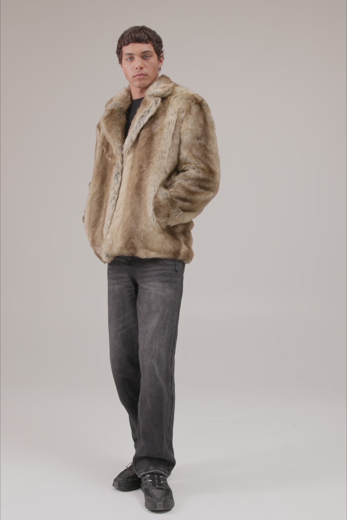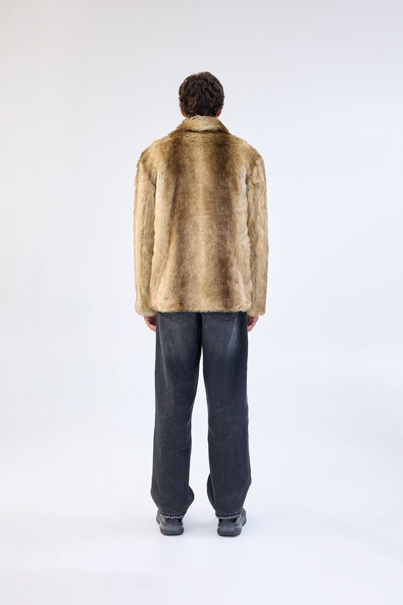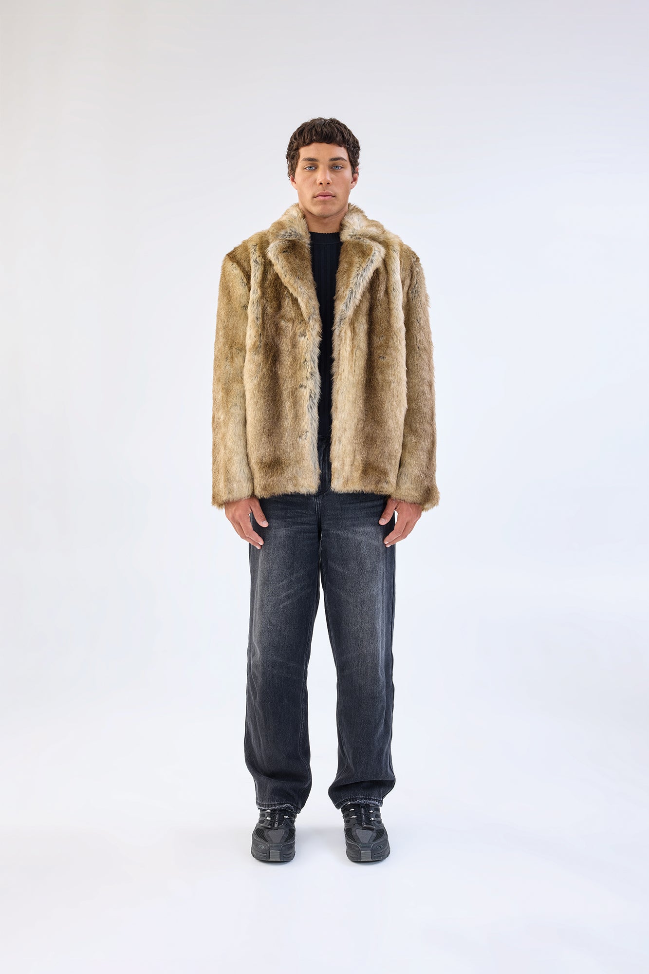 The Lupin Blazer is a faux fur design crafted in a traditional blazer silhouette. The faux fur outer shell features wolf-like colouring and a classic lapel collar.