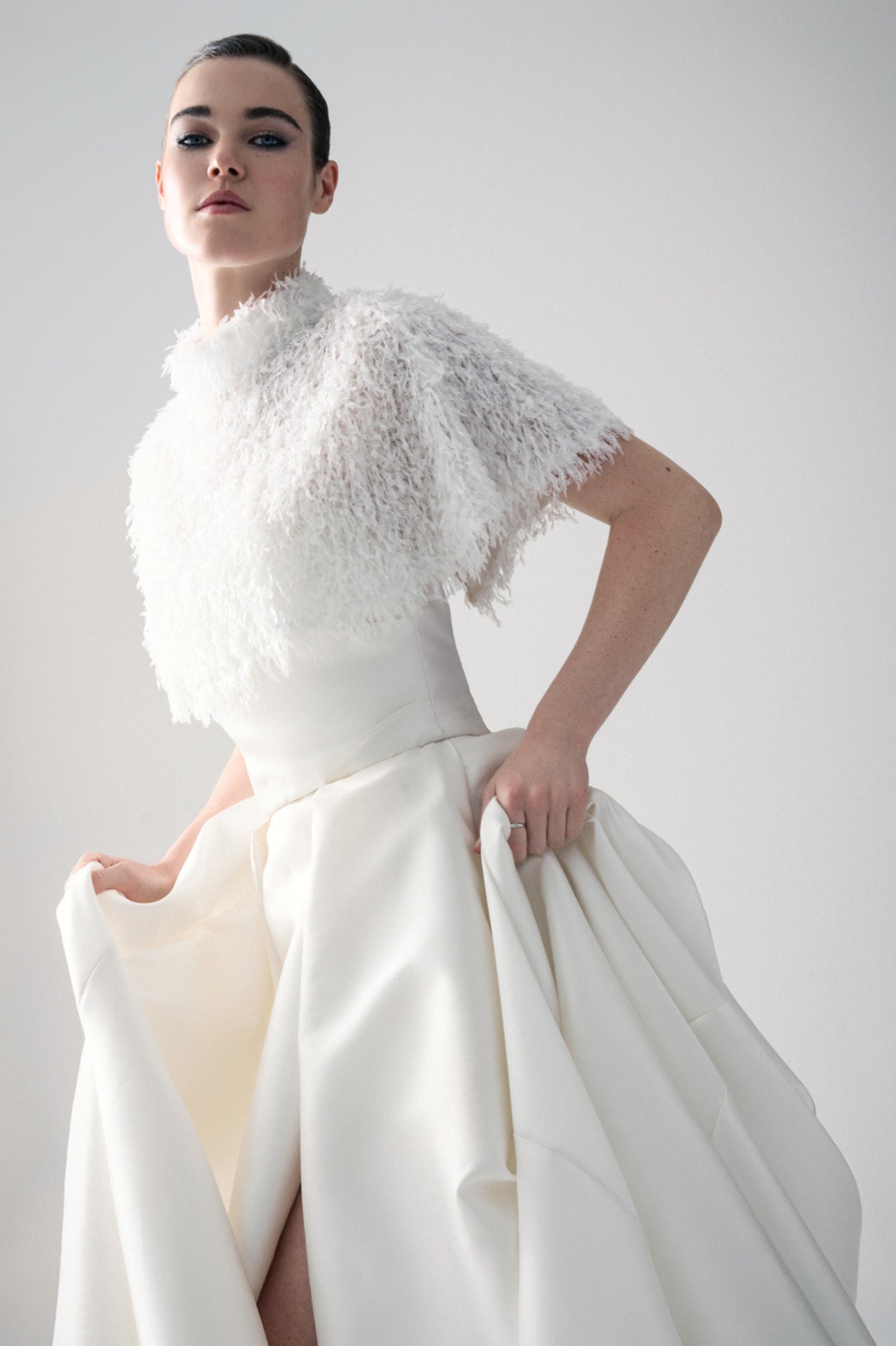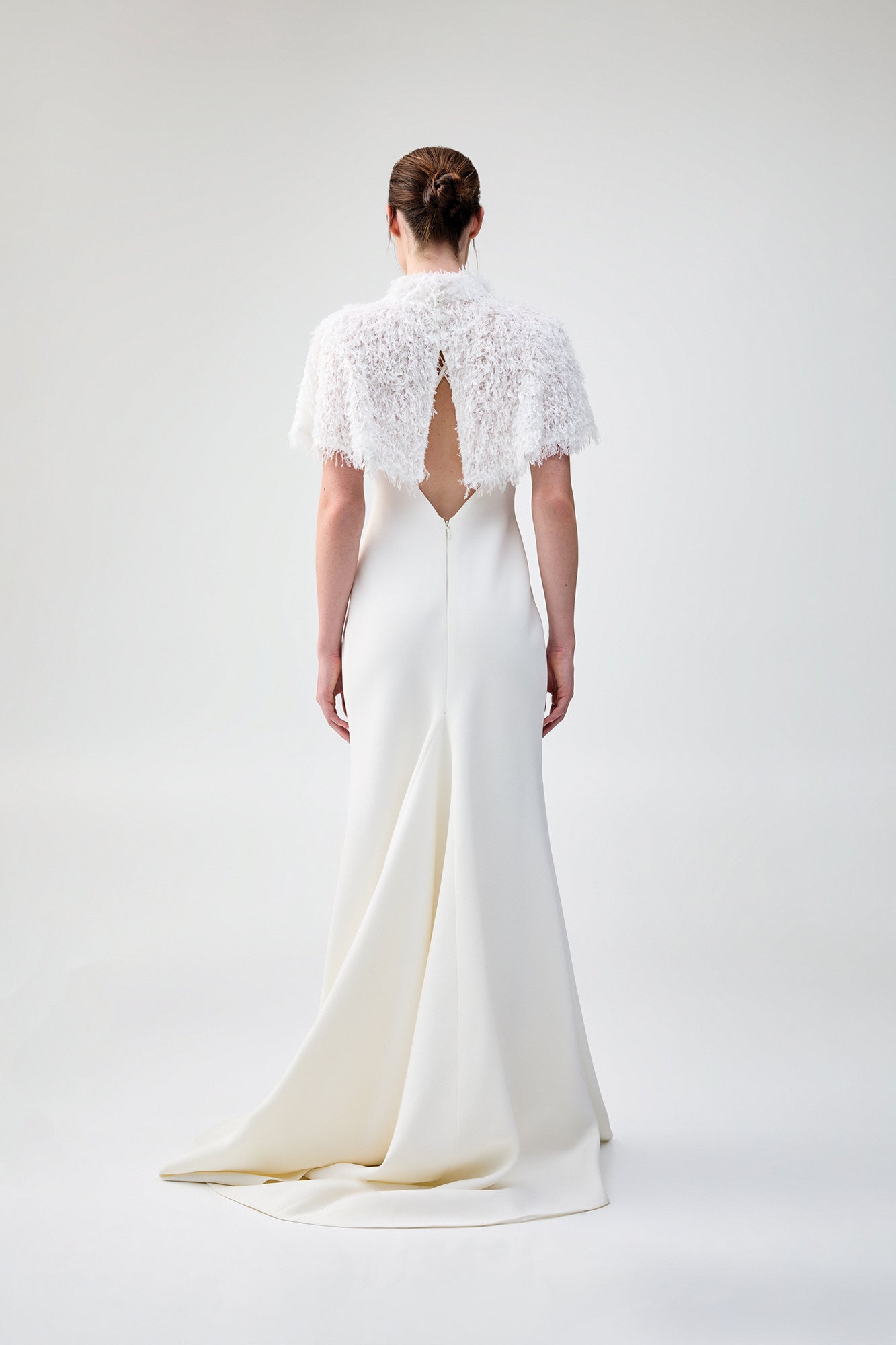 Adorned with lush faux feathers in a cool-toned blanc shade. Featuring a chic high collar, and four button closers along the back. The Cape Verde adds dimension to the silhouette of any special occasion look.